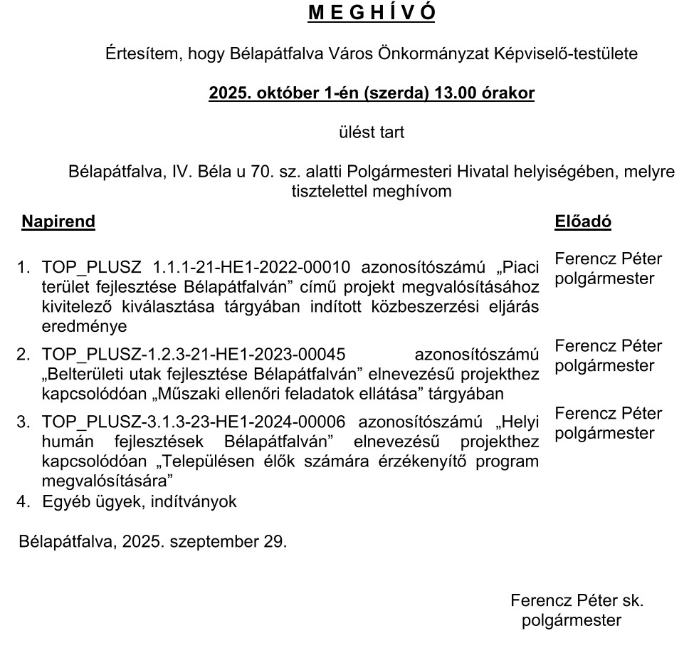 MEGHÍVÓ Képviselő-testület 2025. október 1.-i ülésére