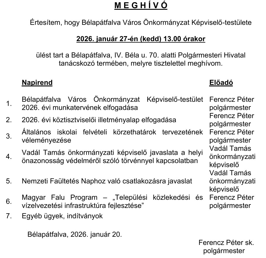 MEGHÍVÓ Képviselő-testület 2026. január 27.-i ülésére
