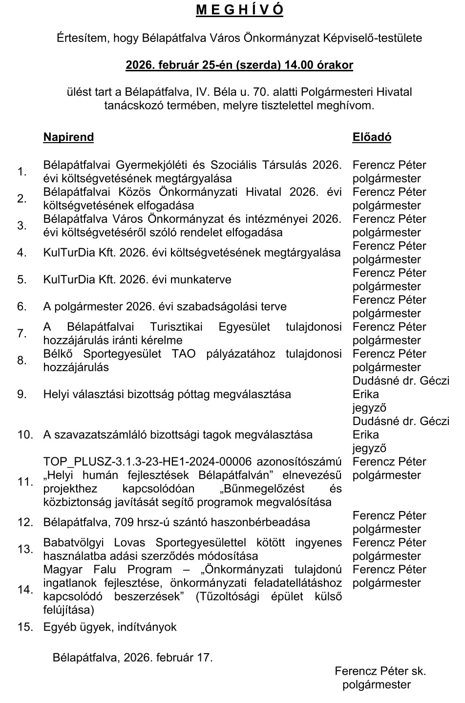 MEGHÍVÓ Képviselő-testület 2026. február 25.-i ülésére