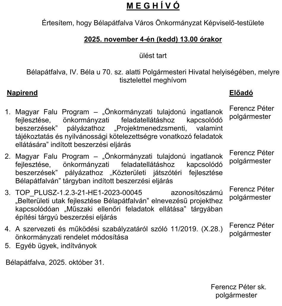 MEGHÍVÓ Képviselő-testület 2025. november 4.-i ülésére