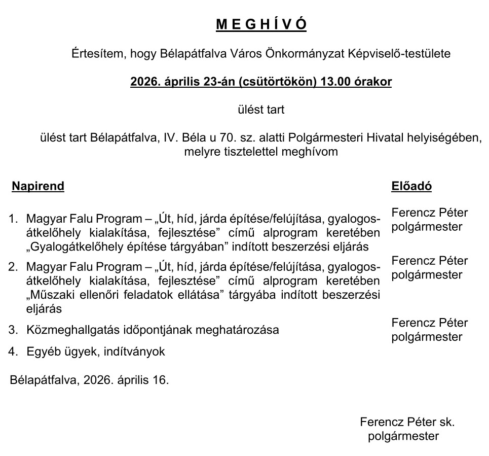 MEGHÍVÓ Képviselő-testület 2026. április 23.-i ülésére