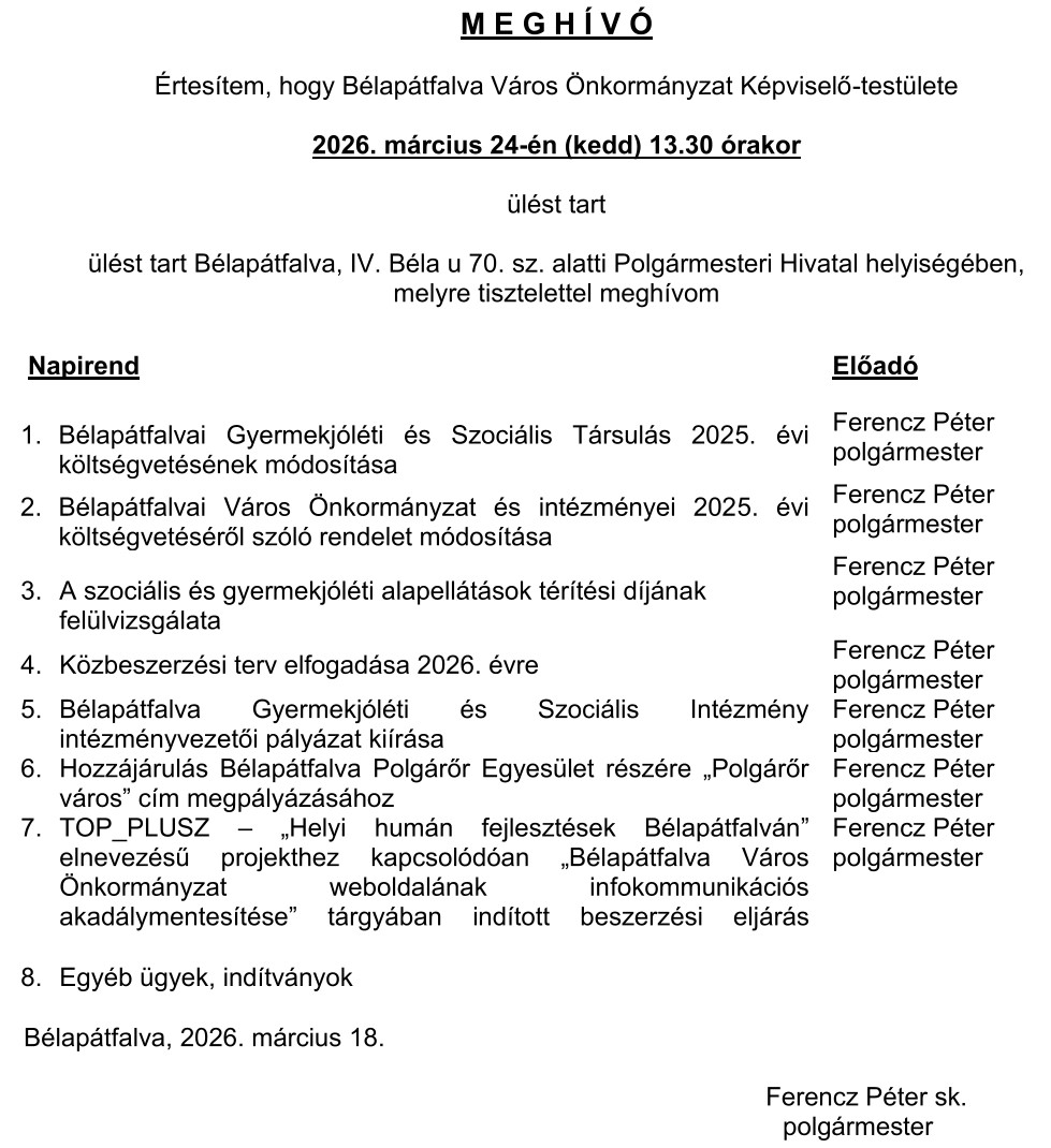 MEGHÍVÓ Képviselő-testület 2026. március 24.-i ülésére