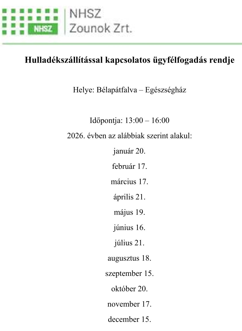 Hulladékszállítással kapcsolatos ügyfélfogadás rendje
