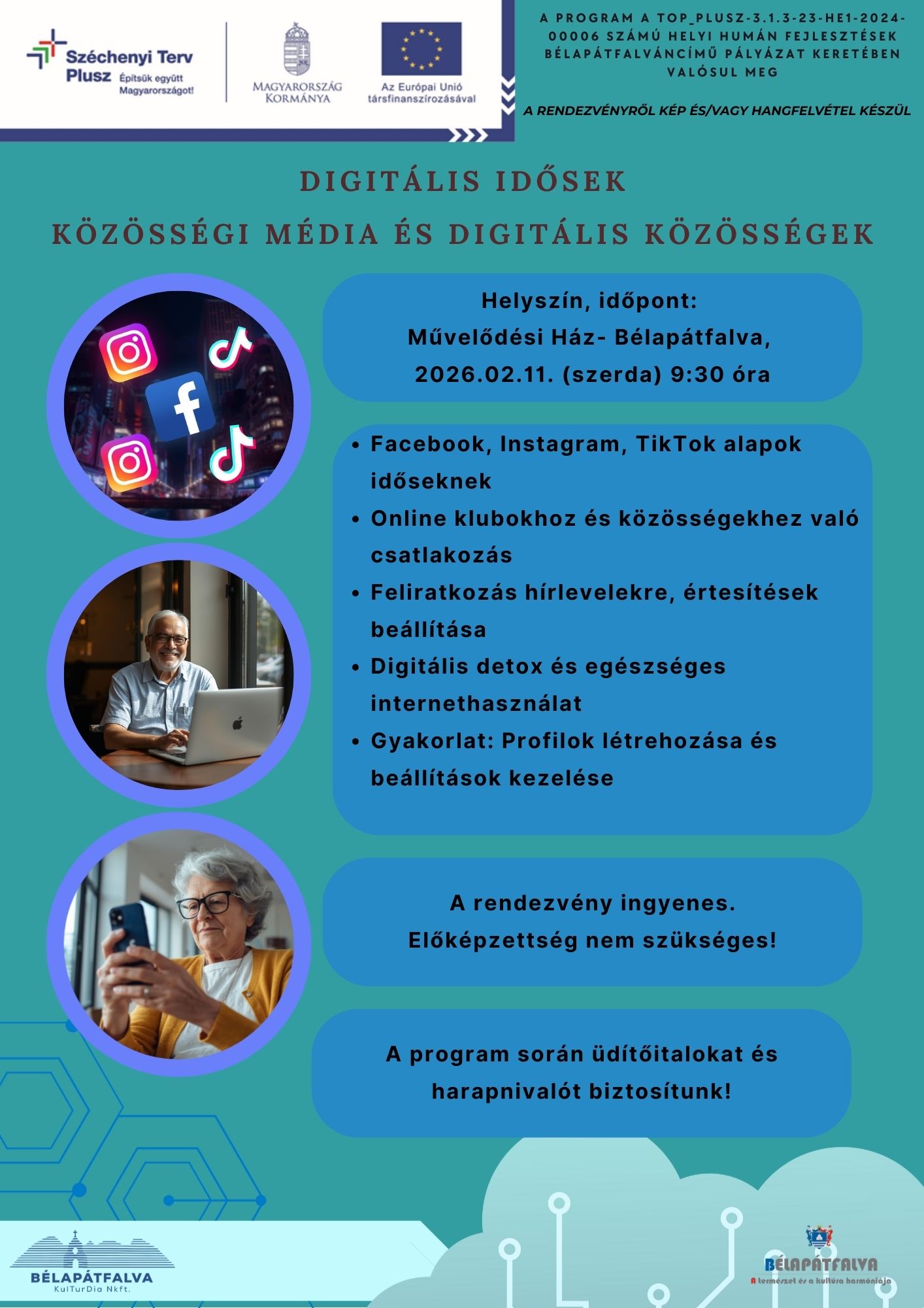 - Digitális kompetenciafejlesztés, elsősorban idősek számára, a digitális világban való tájékozódás elősegítésére.